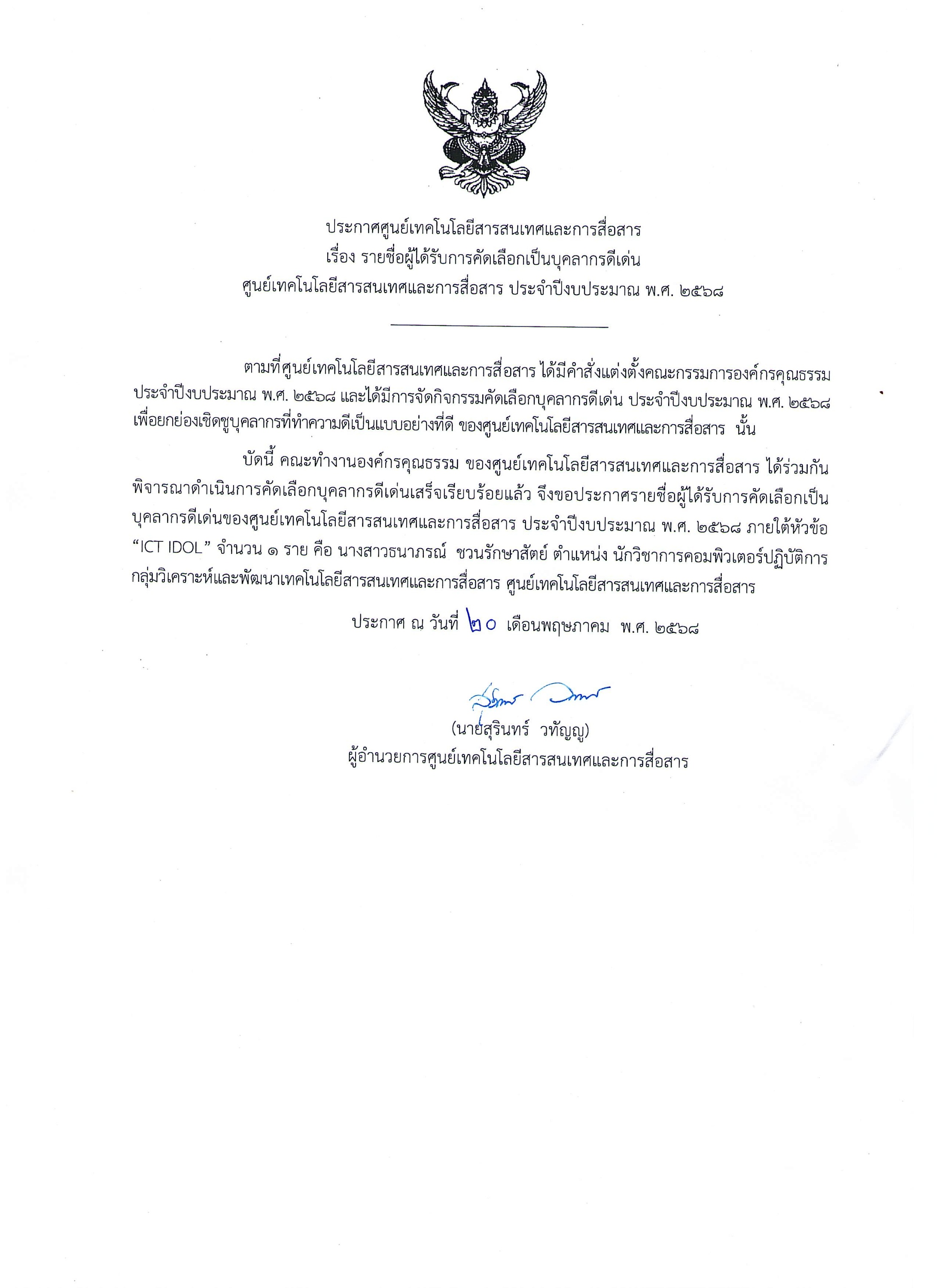 ประกาศศูนย์เทคโนโลยีสารสนเทศและการสื่อสาร เรื่อง รายชื่อผู้ได้รับการคัดเลือกเป็นบุคลากรดีเด่น ศูนย์เทคโนโลยีสารสนเทศและการสื่อสาร ประจำปีงบประมาณ พ.ศ. 2568